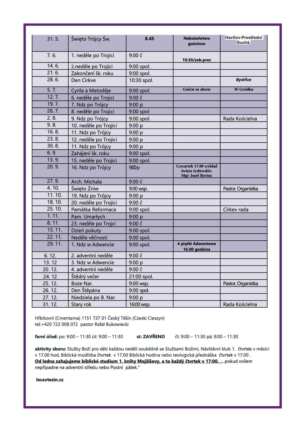 Každou neděli v 9:00 se v našem kostele Zmrtvýchvstání Páně konají pravidelné bohoslužby na adrese Hřbitovní 1151/14a, Český Těšín, 737 01. Další podrobnosti najdete v aktuálním plánu bohoslužeb: